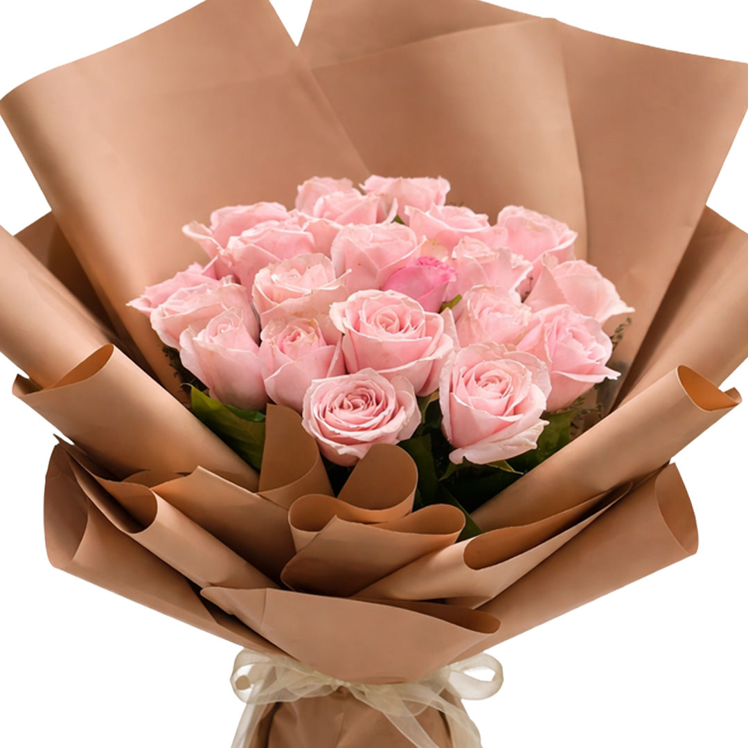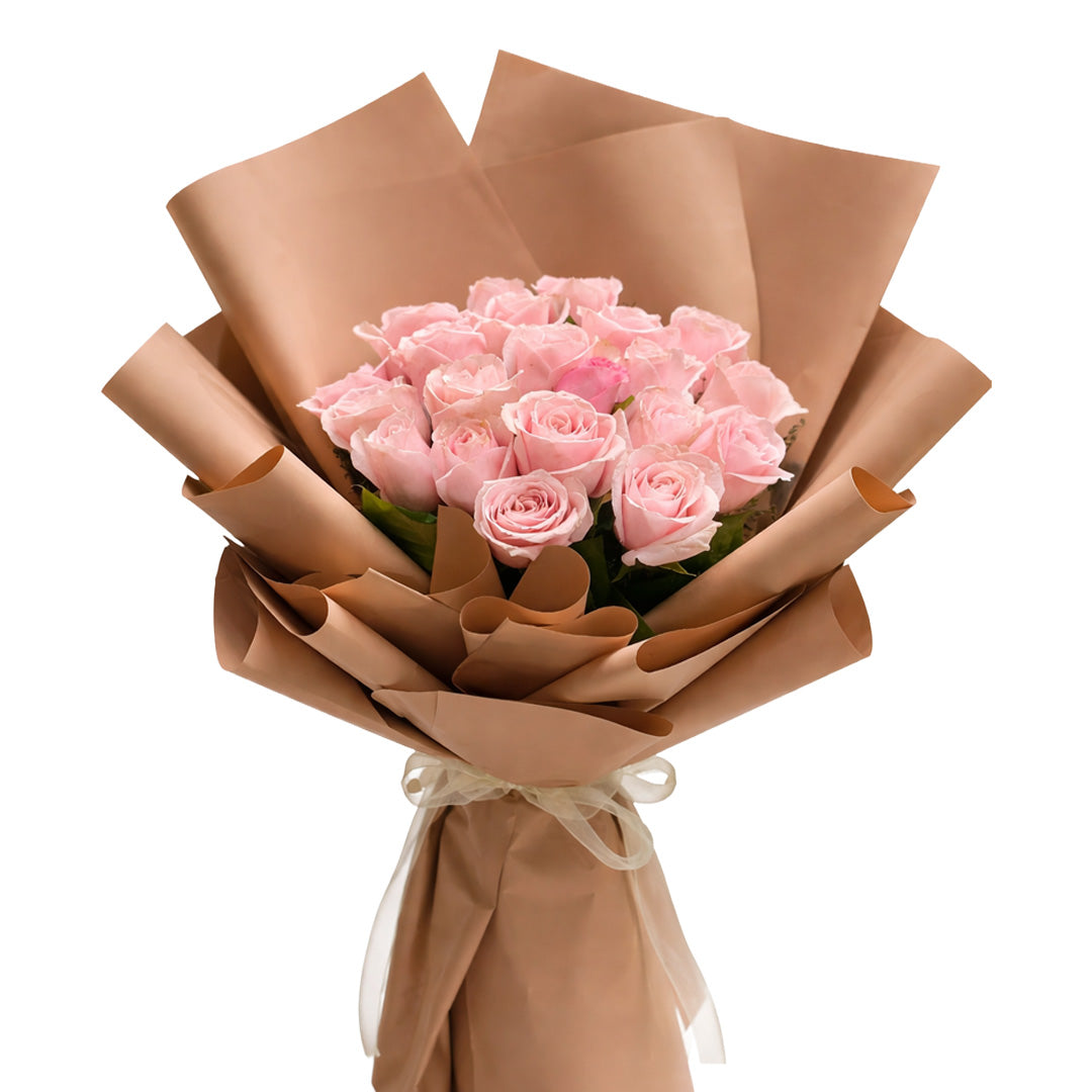 A charming collection of pastel pink roses wrapped in earthy brown kraft paper and tied with a soft sheer ribbon.... Read more