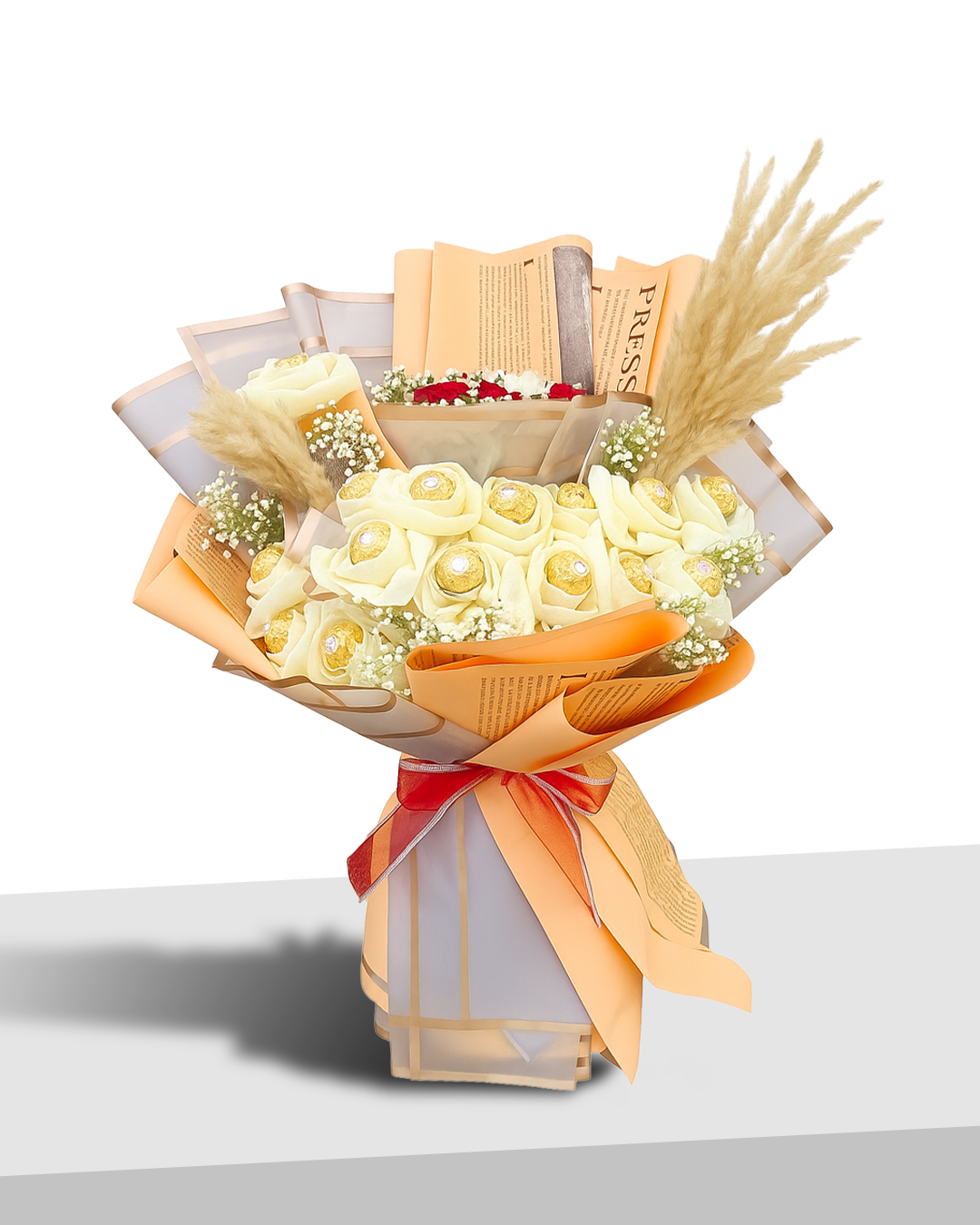 A luxurious blend of soft yellow roses, golden Ferrero Rocher chocolates, and rustic pampas grass — wrapped in warm-toned paper with a pop of red ribbon, this bouquet is a whisper of elegance and indulgence in every detail.