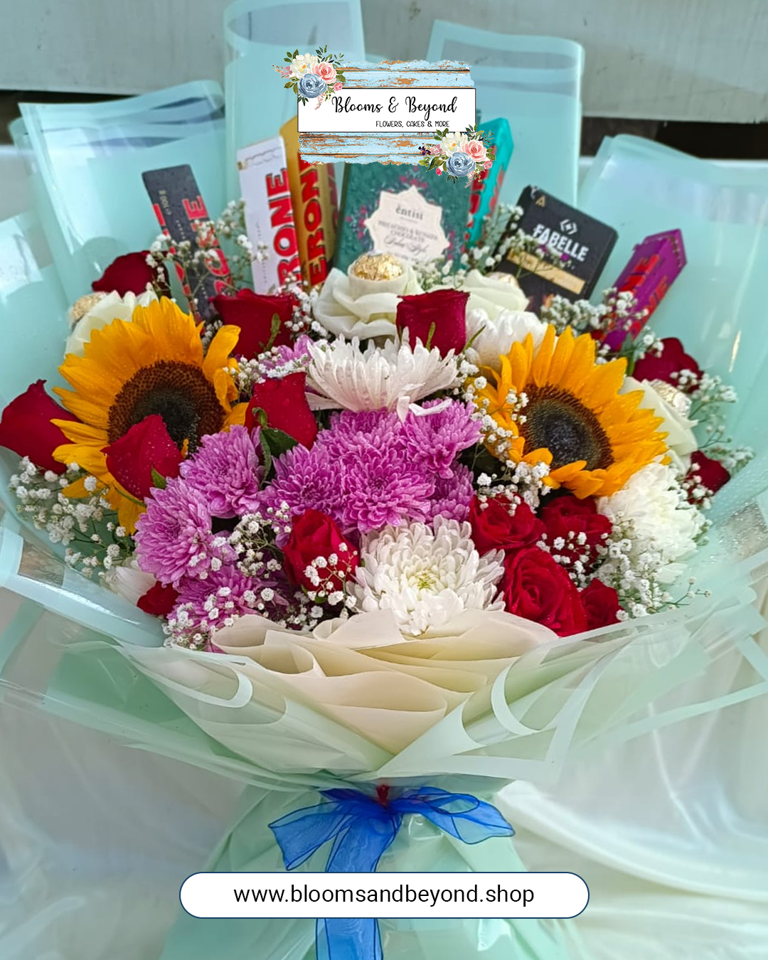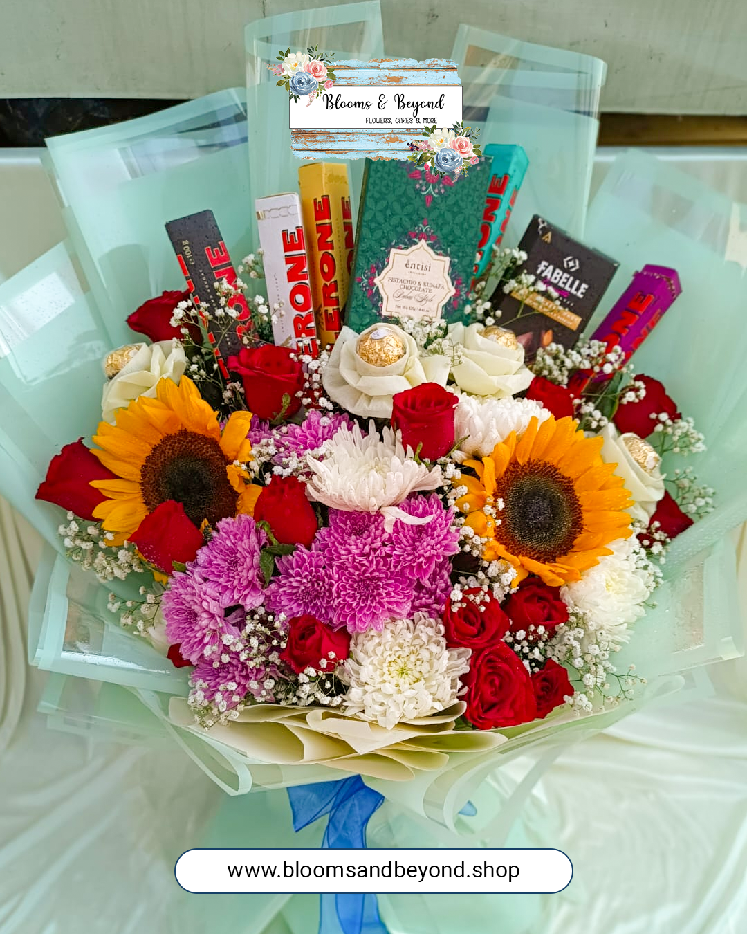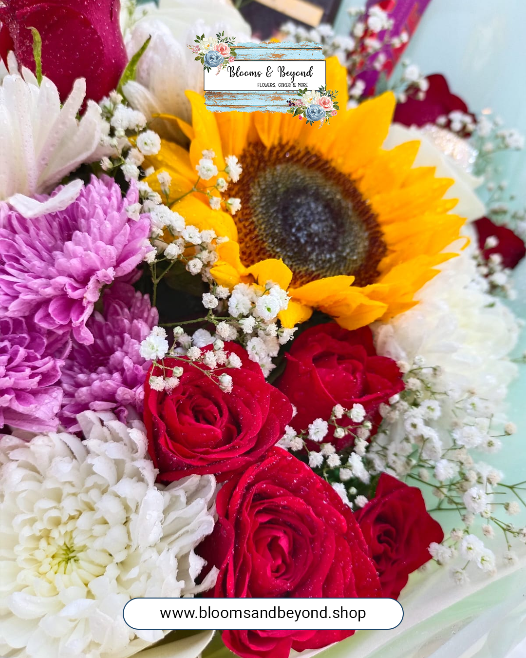 The ultimate celebration bouquet. A vibrant mix of fresh roses, sunflowers, chrysanthemums, and baby’s breath — elevated with premium assorted... Read more