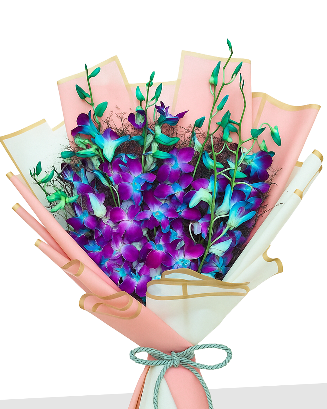 A stunning bouquet of vibrant purple-blue orchids, wrapped in soft blush and ivory tones — a perfect blend of elegance and mystery, handcrafted to speak the language of grace.