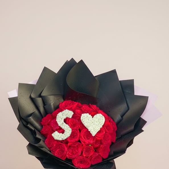 The bouquet is uniquely designed with a custom floral initial and heart shape, crafted with delicate white baby’s breath flowers, making it a truly special and personalized gift for someone you love. The contrast of vibrant red roses with elegant black wrapping adds a modern and luxurious touch.