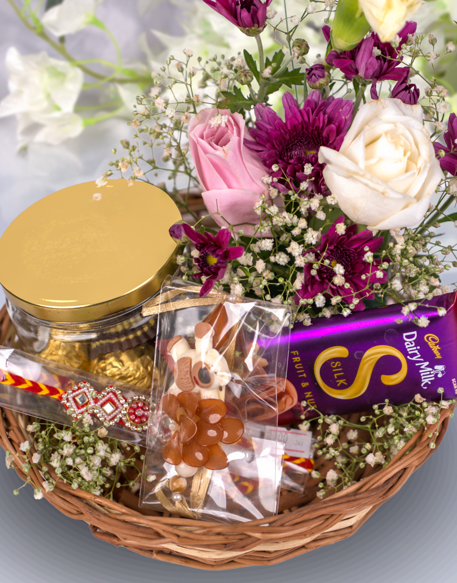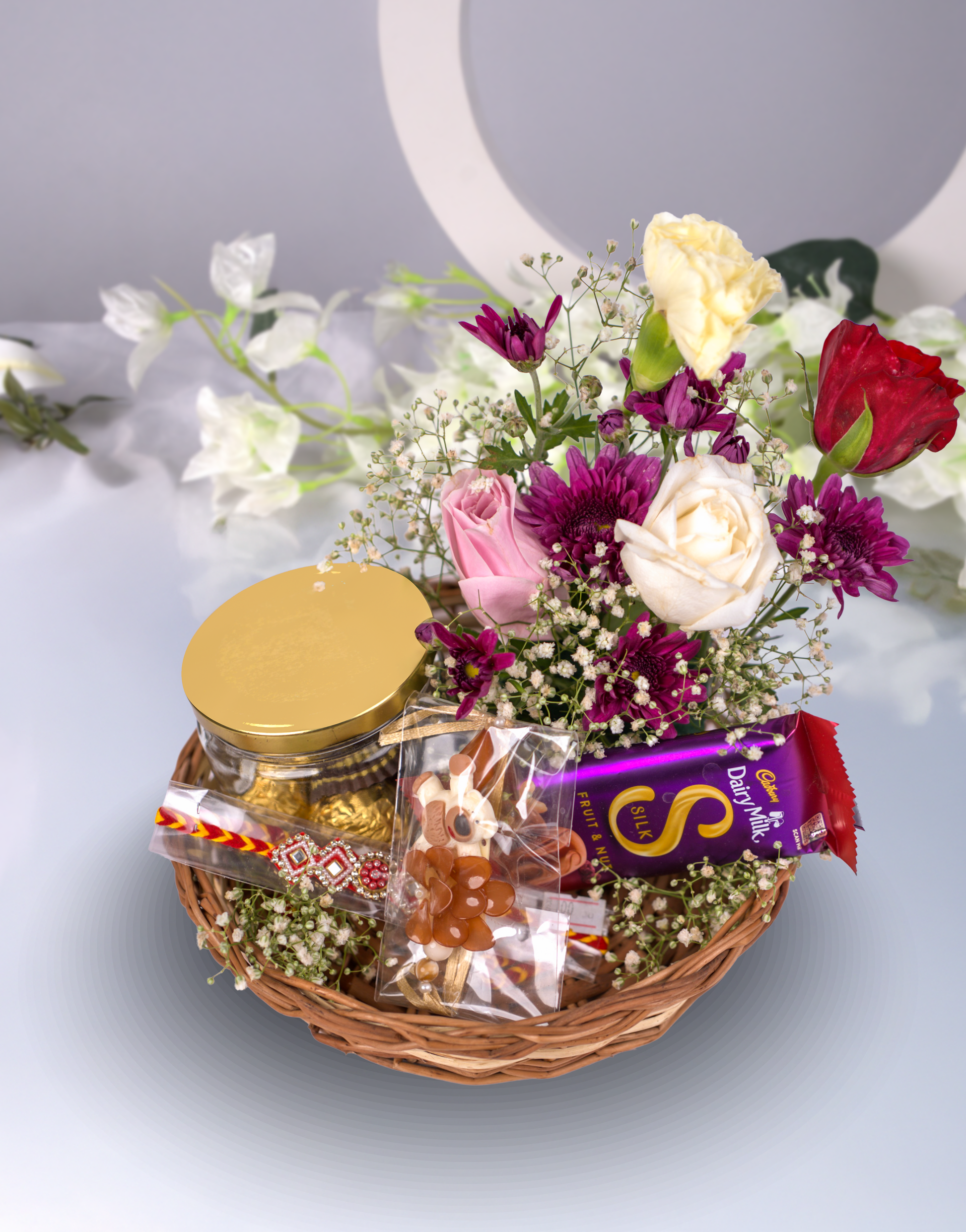 Includes: 2 Rakhi, 1 Chocolate, Ferrero Rocher T4 Jar, Floral Decor